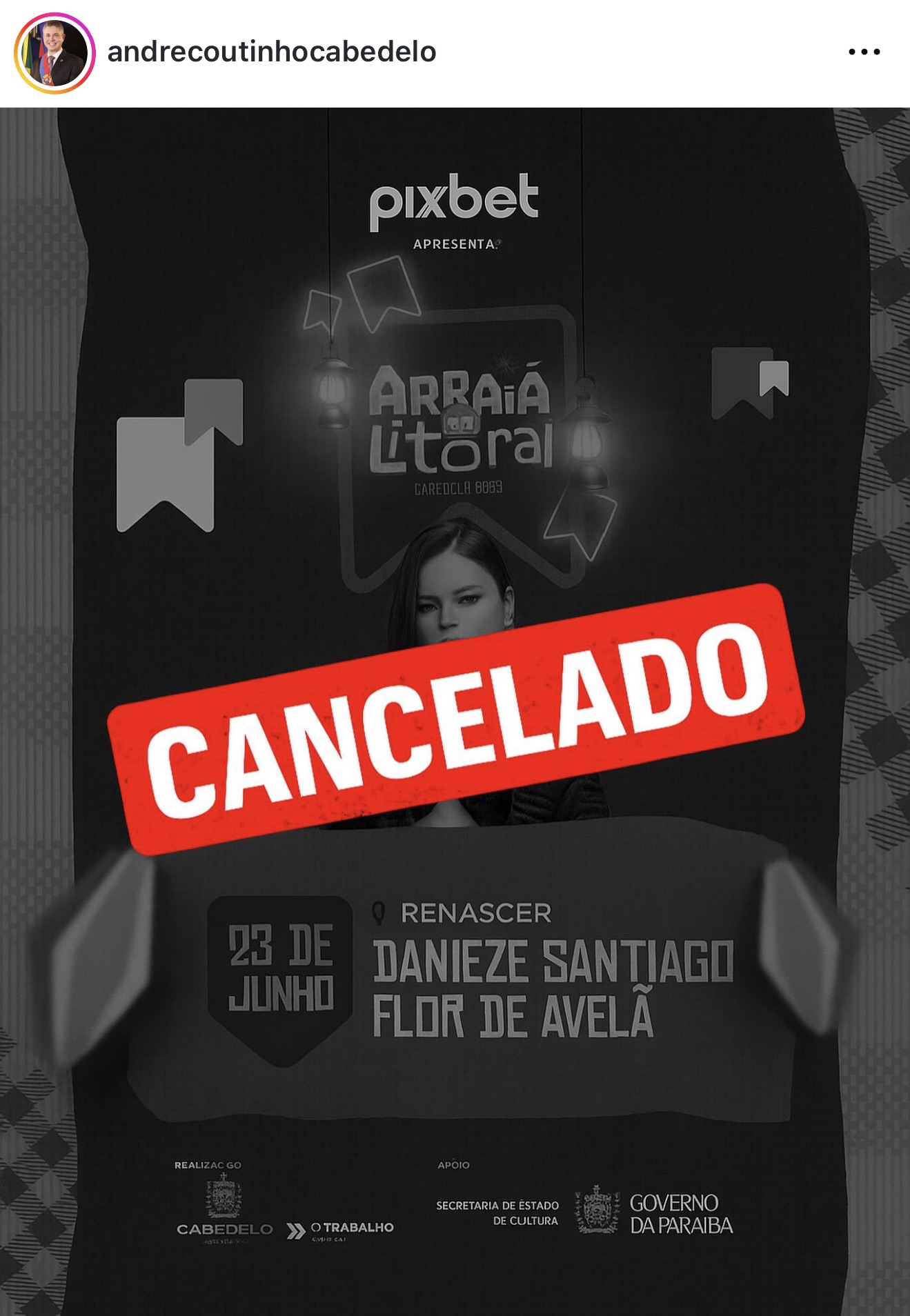 A situação econômica da Prefeitura de Cabedelo parece que não anda bem. Após editar decreto em que a determina a redução de 20% nas despesas, o prefeito André Coutinho (Avante) usou as redes sociais para informar o cancelamento da programação do Arraiá do Litoral no bairro do Renascer.
