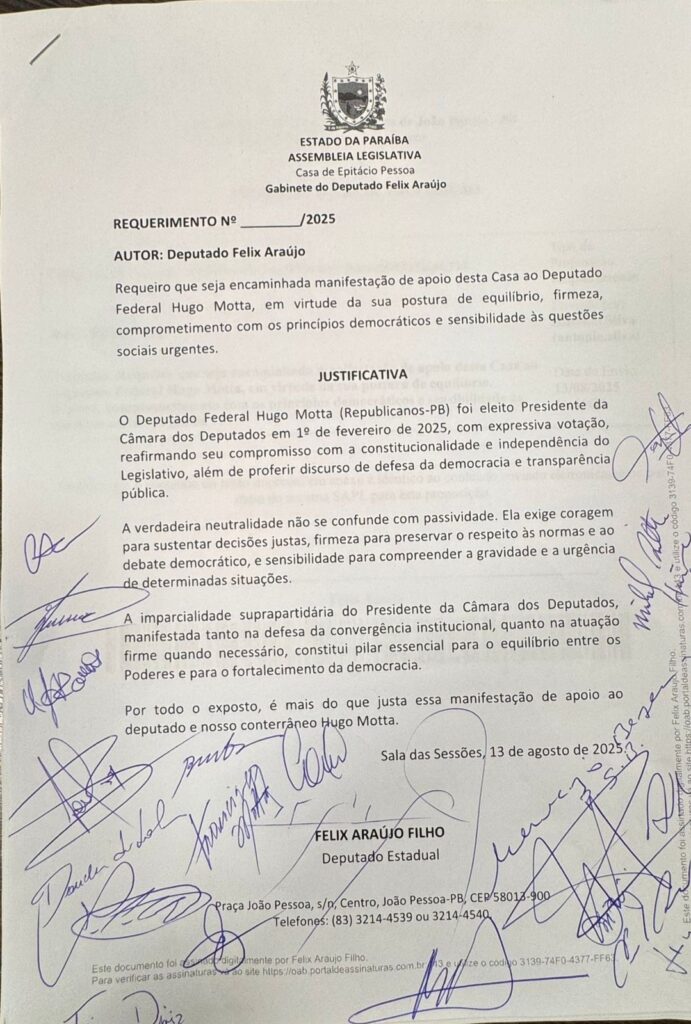 A Assembleia Legislativa da Paraíba aprovou, nesta quarta-feira (13), o Requerimento nº 23.229 de autoria do deputado Félix Araújo (Rede Sustentabilidade), com manifestação de apoio ao presidente da Câmara Federal, deputado Hugo Motta (Republicanos).