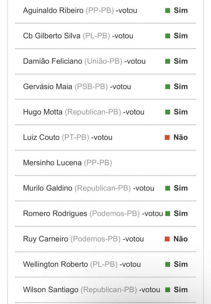 Na votação em 1º turno, dos 12 deputados federais paraibanos, apenas Luiz Couto (PT) e Ruy Carneiro (Podemos) disseram ‘Não’ à proposta. Em 2º turno, os dois também repetiram o voto, e o de Mersinho Lucena (PP) não aparece.