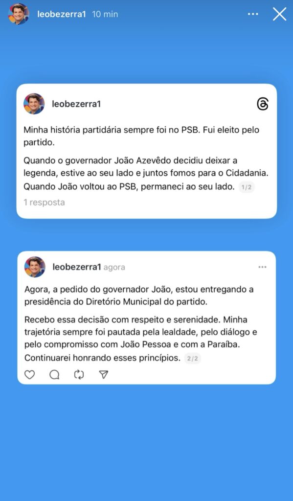 “Minha história partidária sempre foi no PSB. Fui eleito pelo partido. Quando o governador João Azevêdo decidiu deixar a legenda, estive ao seu lado e juntos fomos para o Cidadania. Quando João voltou ao PSB, permaneci ao seu lado”, escreveu Leo em postagem em uma rede social.